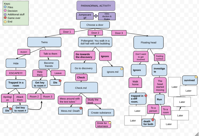 My group and I made an adventure on paranormal activities and since we are three people in the group, we created 3 doors. Each door has it's own story and different decisions to make, some decisions can lead to the end of the adventure and others can lead to another door or an exit.