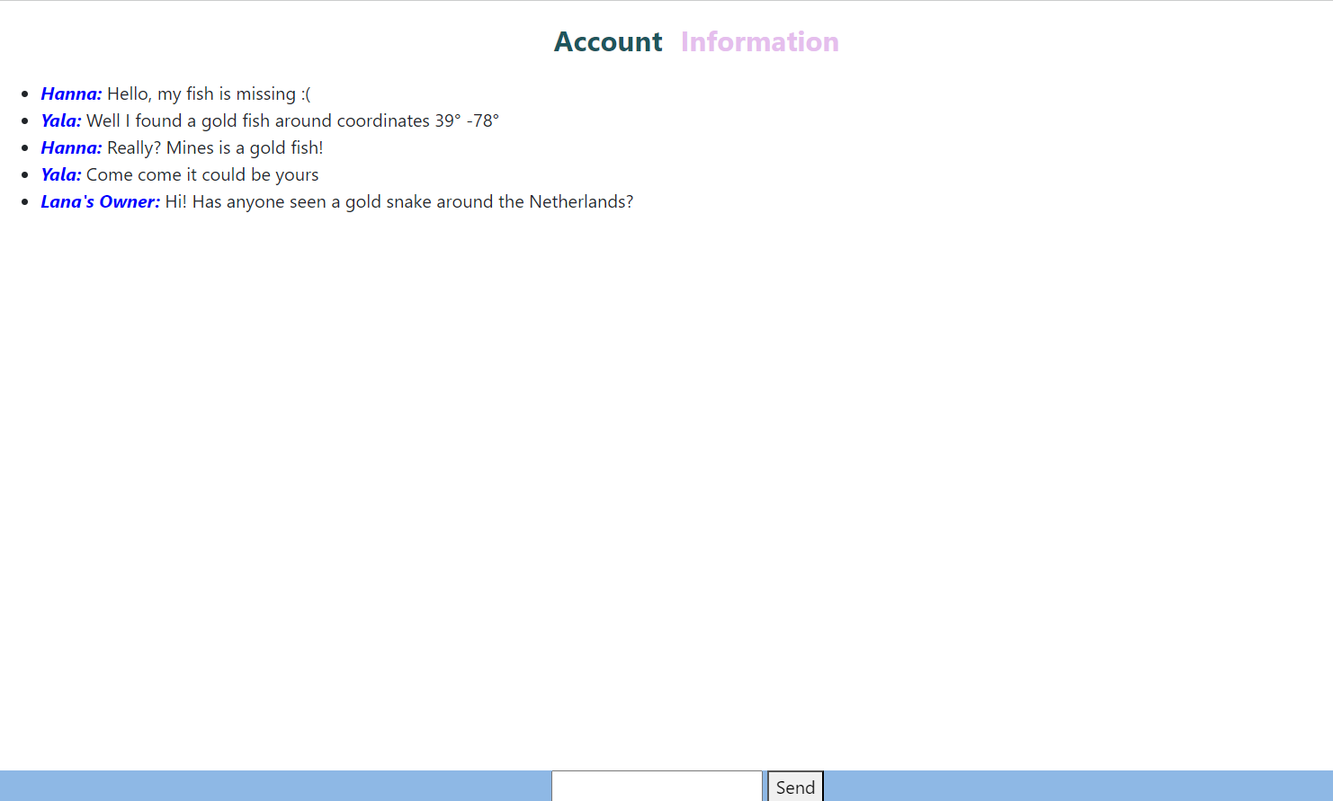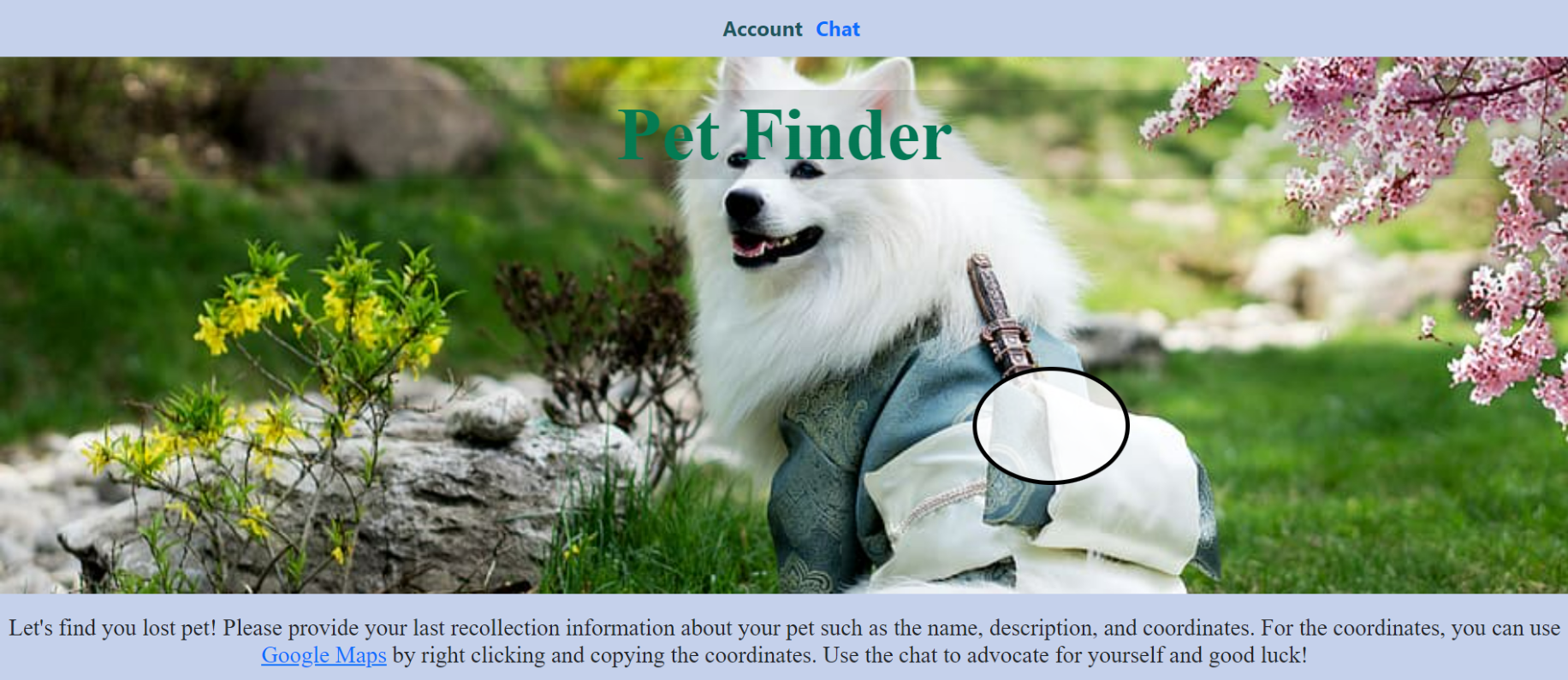 I encountered a few challenges making this project with my group and one of them was making the popups stay open. From this challenge, I learned that it's important to write down your tinkering and look back at them because, without it, I wouldn't have been able to spot my mistake. As for my next steps, I would like to include another page in the web app where you can share your map and let other people see it, similar to how people can see your profile on social media. This way, people can easily see where you lost your pet and locate it. Additionally, I would also like to add a feature where users can either share an image of their lost pet in the chat or add it to the map.